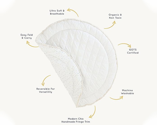 Makemake Organics offers a luxurious option for parents seeking eco-friendly and non-toxic baby playmats. They prioritize the health of your child and the environment by using GOTS-certified organic cotton for their plush playmats. This certification (Global Organic Textile Standard) guarantees that the cotton meets strict environmental and social criteria throughout production, from seed to finished product. Additionally, Makemake Organics uses Azo-free, non-toxic, eco-friendly dyes, eliminating any potential exposure to harmful chemicals for your little one.