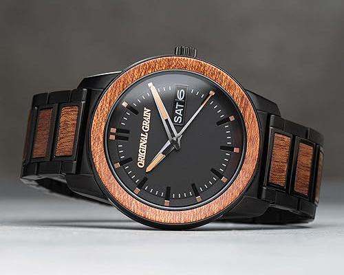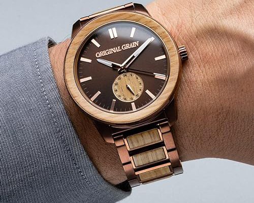 Whiskey Barrel Magic: The heart of Original Grain lies in its signature material – reclaimed whiskey barrels. These barrels, once used to age America’s finest spirits, are transformed into watch cases, offering a unique aesthetic with beautiful wood grain patterns and subtle hints of the barrel’s past life. Each watch tells a story, making it a conversation starter and a treasured possession.